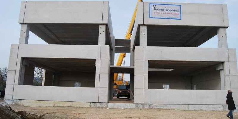 Example of a prefabricated building complete with thermal cut cladding and winged tile roof. Once completed, this Generale Prefabbricati Industrialised Building Division BIMAL Srl research centre will host a major aerospace company.