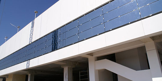 Prefabricated structure multi-purpose building constructed by Generale Prefabbricati with GRC cladding architectural panels with white Carrara marble finish.