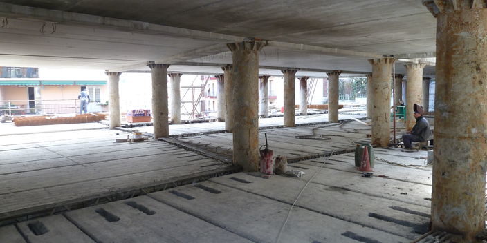 Fourniture de planchers alvéolaires Spiroll pour la réalisation d’un parking pluri-étages avec la technologie du top down; à savoir la réalisation des tabliers du haut vers le bas. Une technique utilisée dans les cas où il n’est pas nécessaire d’interférer avec les fondations d’édifices déjà existants avec des creusements et des cloisons de type traditionnel.